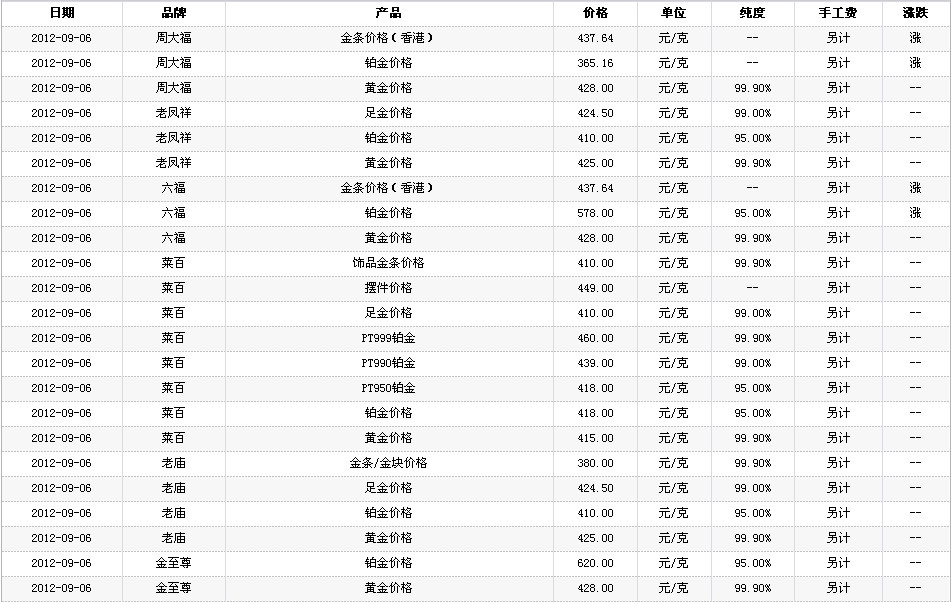 9月6日 实物黄金价格
