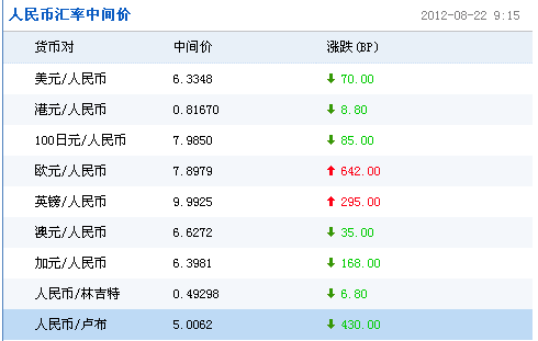 2012年8月22日人民币汇率中间价